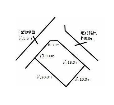 | 接道状況 | 状況:角地北東側 幅員5.8m 公道 20m接面北西側 幅員5.8m 公道 11m接面 | ||