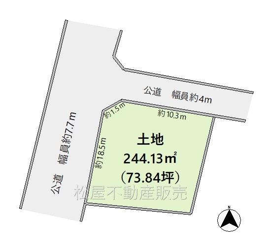 | 接道状況 | 状況:角地西側 幅員7.7m 公道 18.5m接面北側 幅員4m 公道 10.3m接面 | ||