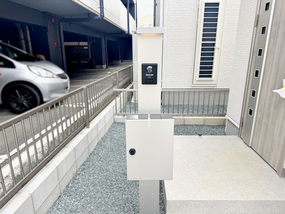 外観お洒落な一体型で場所を取らない、玄関前のカメラ付インターホン・ポスト