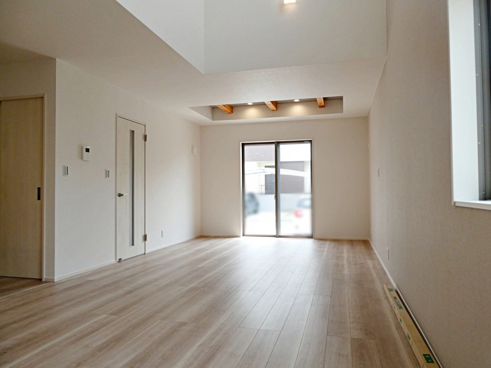 居間リビングは21.7帖。大きな吹き抜けがあるので、広々として明るく自然と家族みんなが集まる空間です