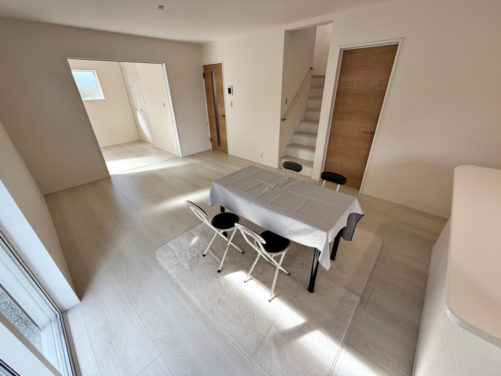 居間キッチン目線で撮影。キッチンから料理をしながらリビングの家族の様子が確認できます!
