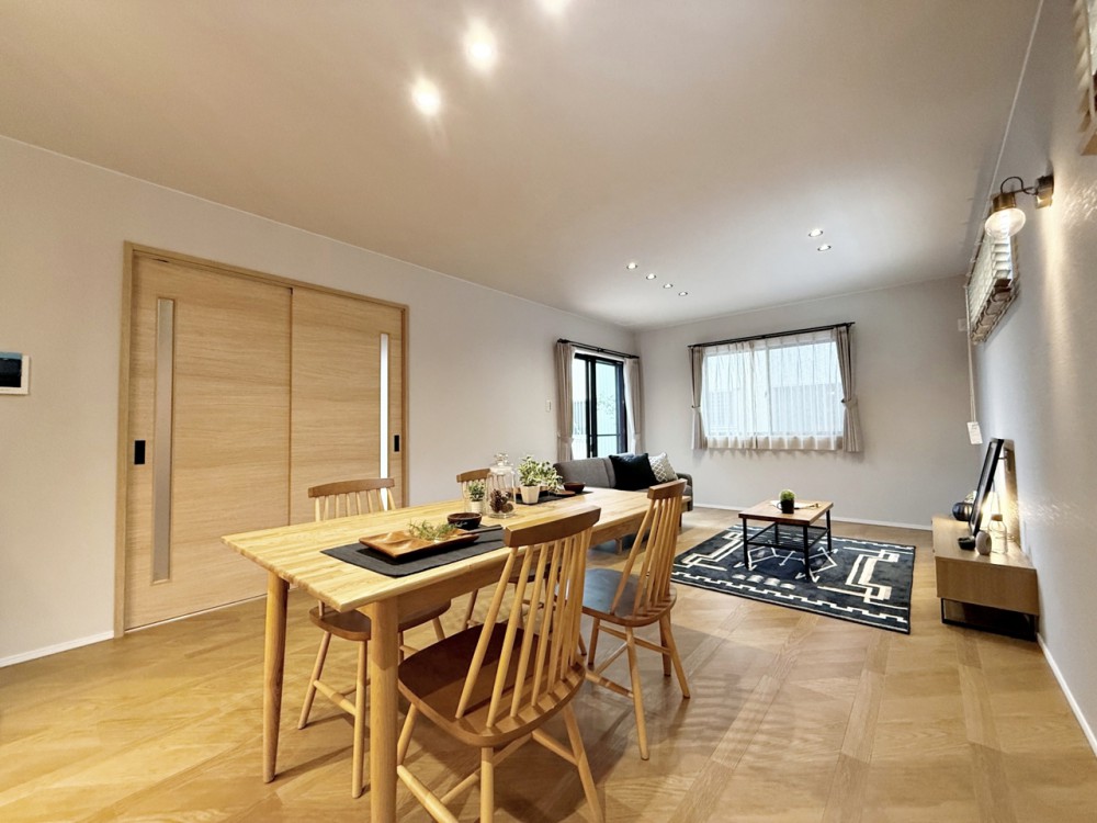 居間温かみのあるナチュラルテイストのLDK。ダイニングセットを置いてもゆとりがあります! 。
