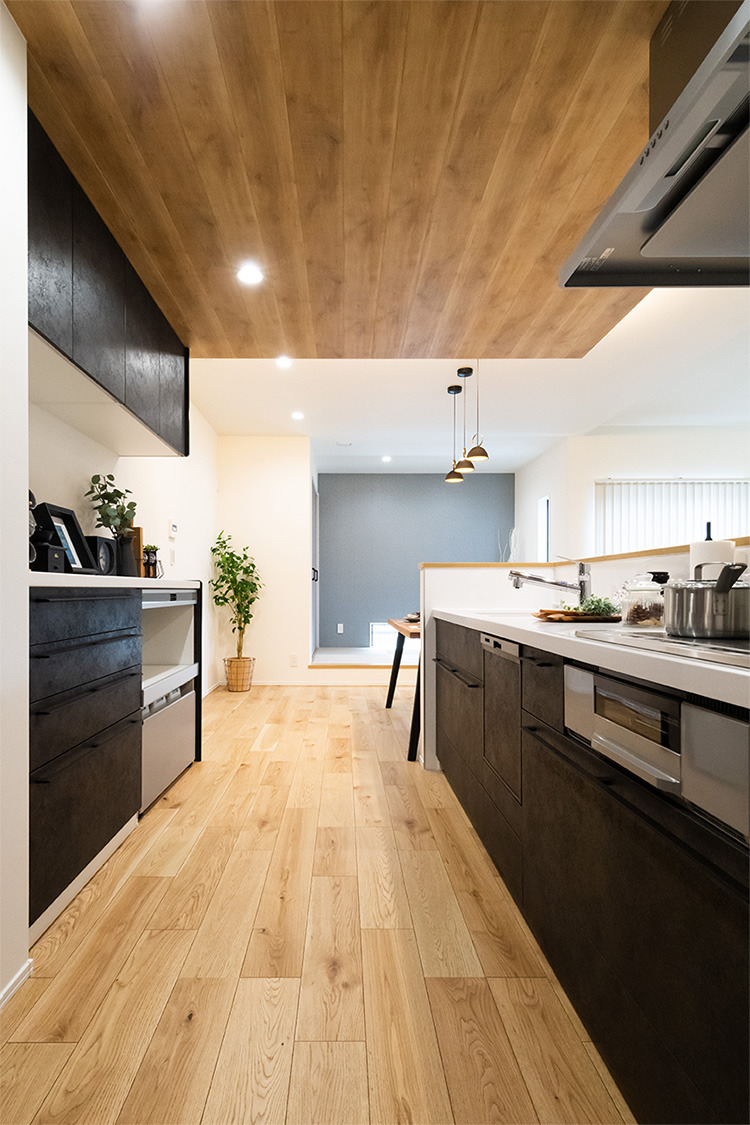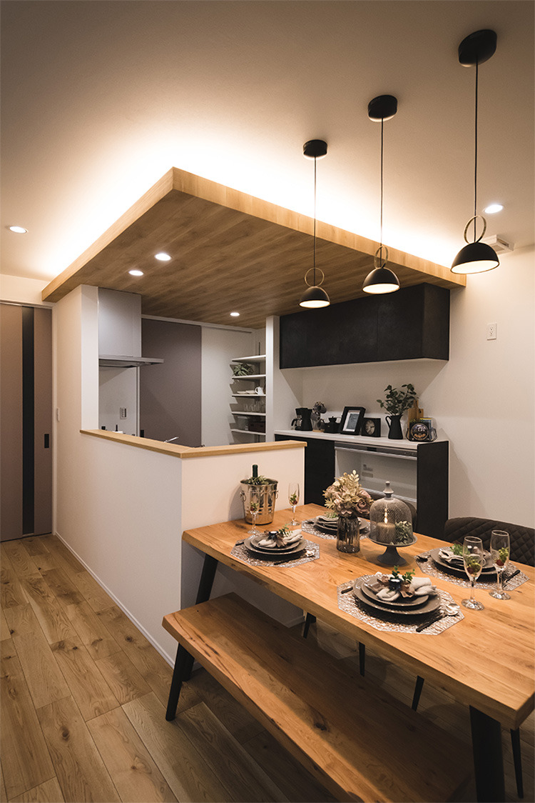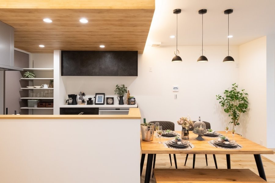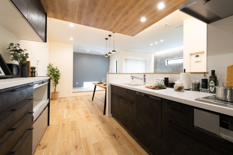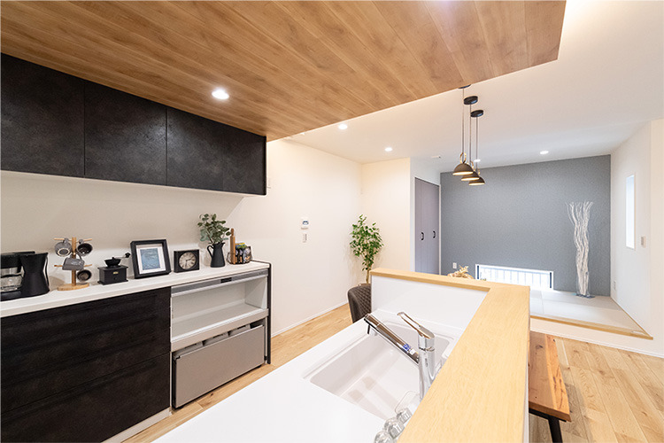 キッチン折り下げ天井が空間にアクセントを添える対面キッチンです