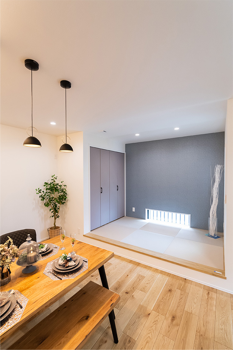 内装リビングに隣接した小上がりの畳コーナー、くつろぎや多用途に活用できる空間です