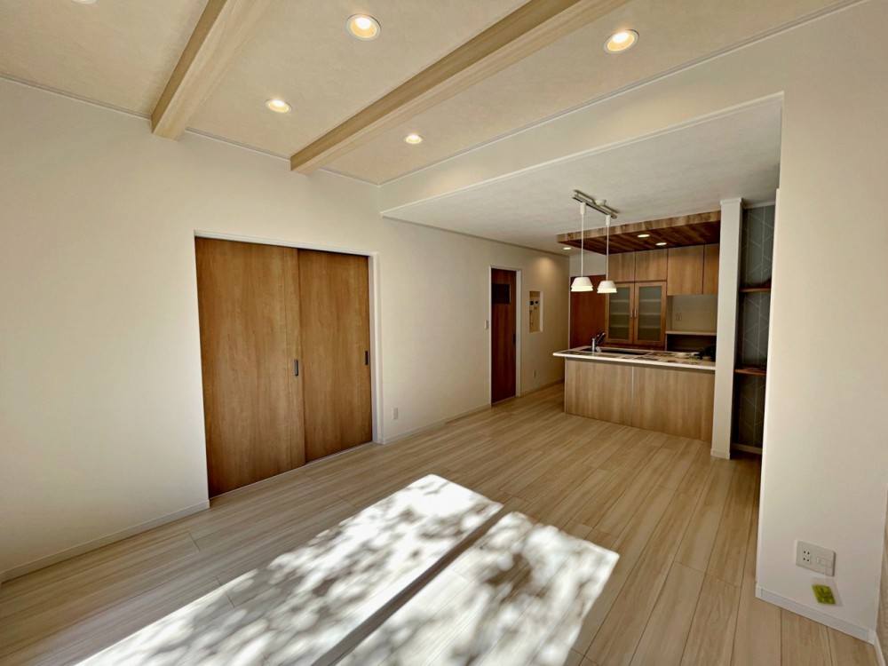居間【施工例】温かみのあるナチュラルテイストのLDK。ダイニングセットを置いてもゆとりがあります!