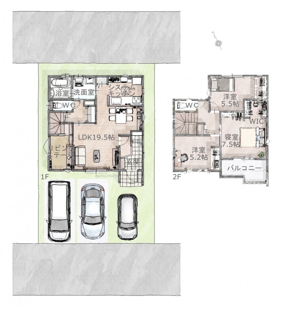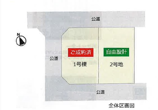 外観【2号棟】建設予定地です! ・日当たり良好 ・整形地 ・3LDK ・LDK19.5帖、リビングステージ ・全居室収納完備 ・家事動線良好 ・食器洗浄乾燥機 ・2方向道路 ・並列駐車場2台可