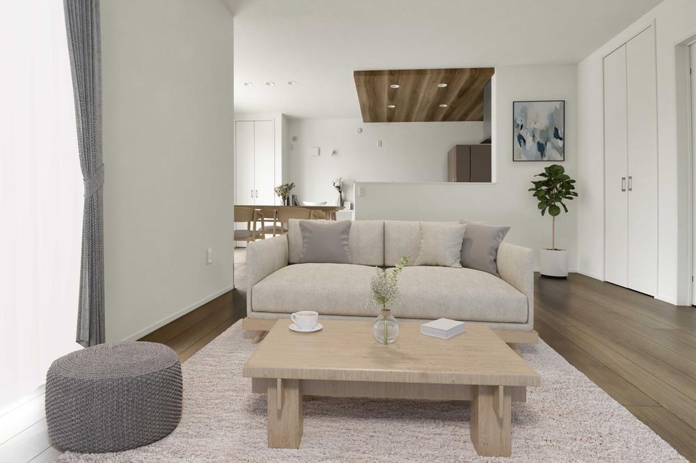 居間大きな窓から柔らかな光が降り注ぎ、明るさが室内の奥まで行き渡ります。