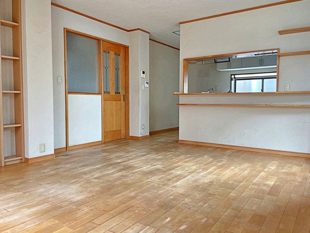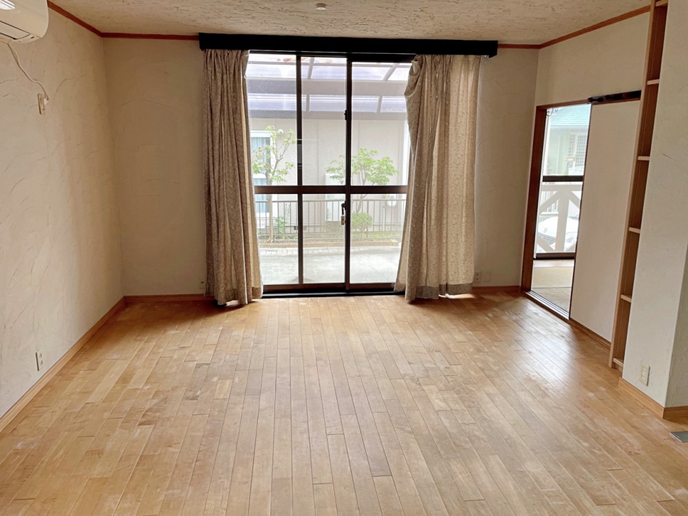 居間大きな窓のあるリビングは、陽光あふれる明るい空間です。居心地良く、ご家族皆がゆったり寛げる憩いの空間となりそうです