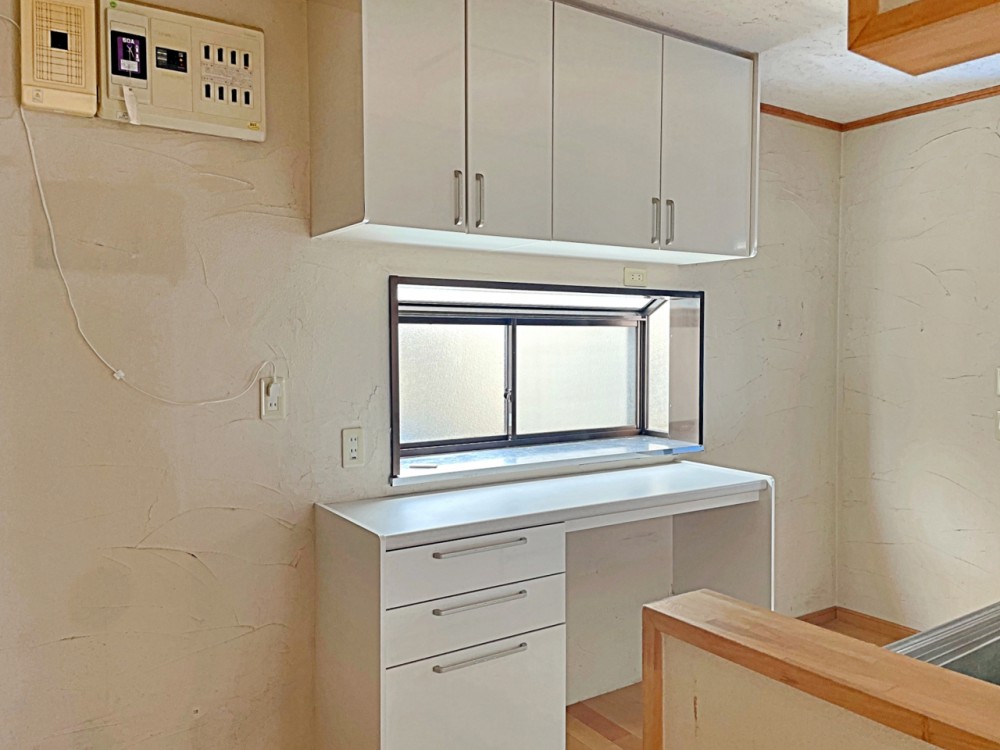 内装キッチン背面のカップボード。収納スペース充実!作業スペースも確保できます。