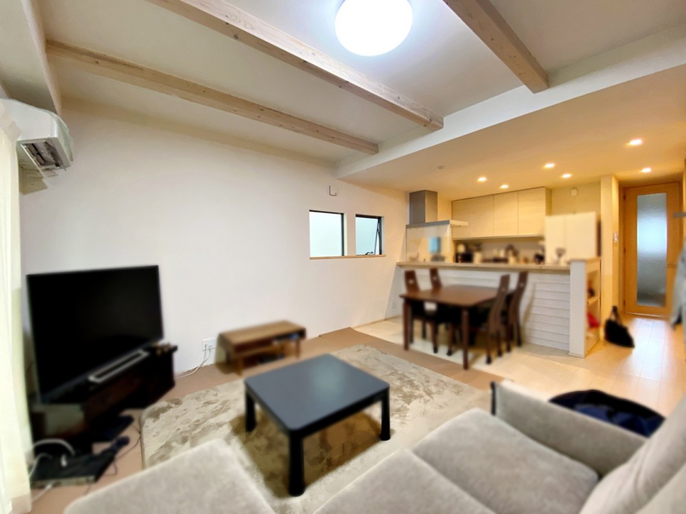 居間温かみのあるナチュラルテイストのLDK。ダイニングセットを置いてもゆとりがあります!