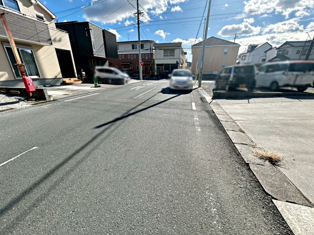 外観前面道路:北東側公道8m幅、車通りが少なく、駐車が苦手な方でも安心の道路幅です