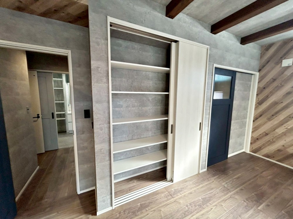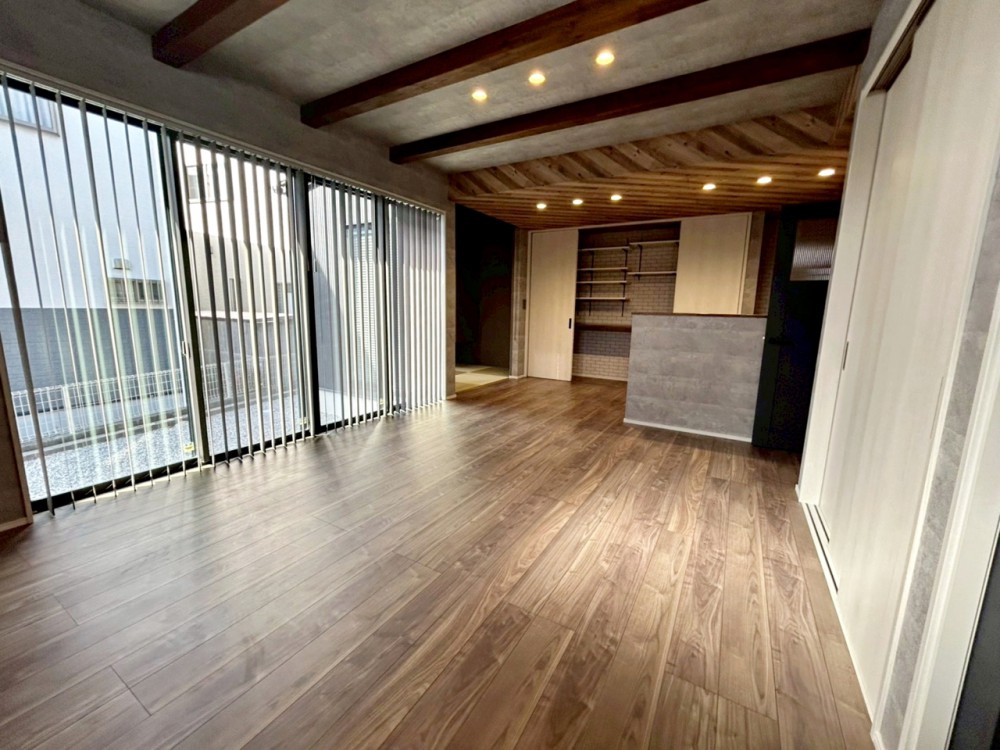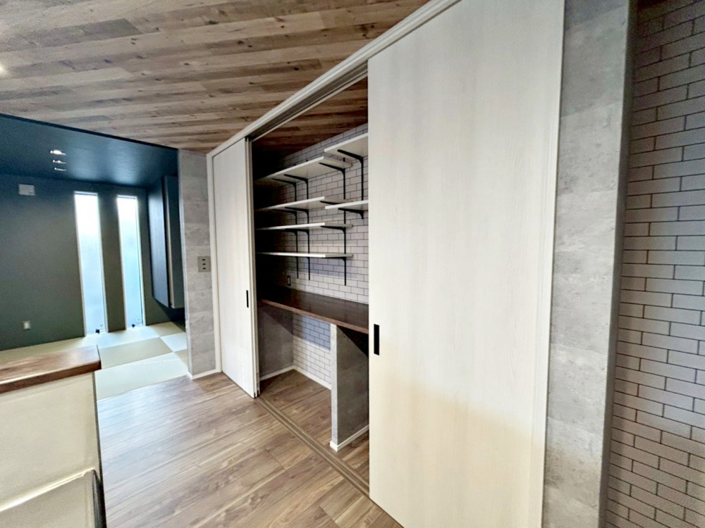 居間対面式キッチンの背面は壁一面の収納。扉を閉めれば家電や食器が隠れキッチンがスタイリッシュな空間になりますね。