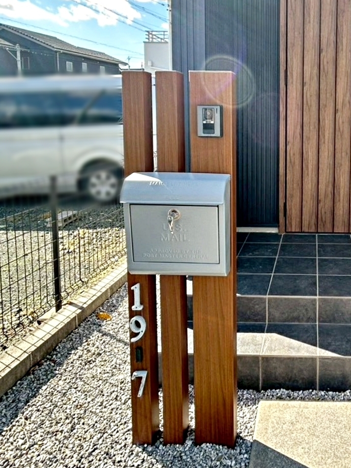 外観ポストやインターホン等一体型のおしゃれな門柱です