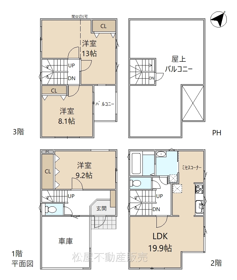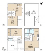 | 備考 | ・居住誘導区域 ・歩いて暮らせるまち区域 ※3階洋室13帖は現状間仕切りされていません ※1階居室は確認申請上、納戸の扱いとなります | ||